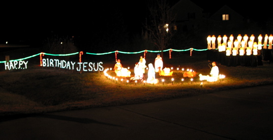 | I saw a house tonight that had Happy Birthday Jesus spelled out in lights, it was so big that it covered the entire side of the house. I'm guessing that they've already ordered the cake and party favors. |